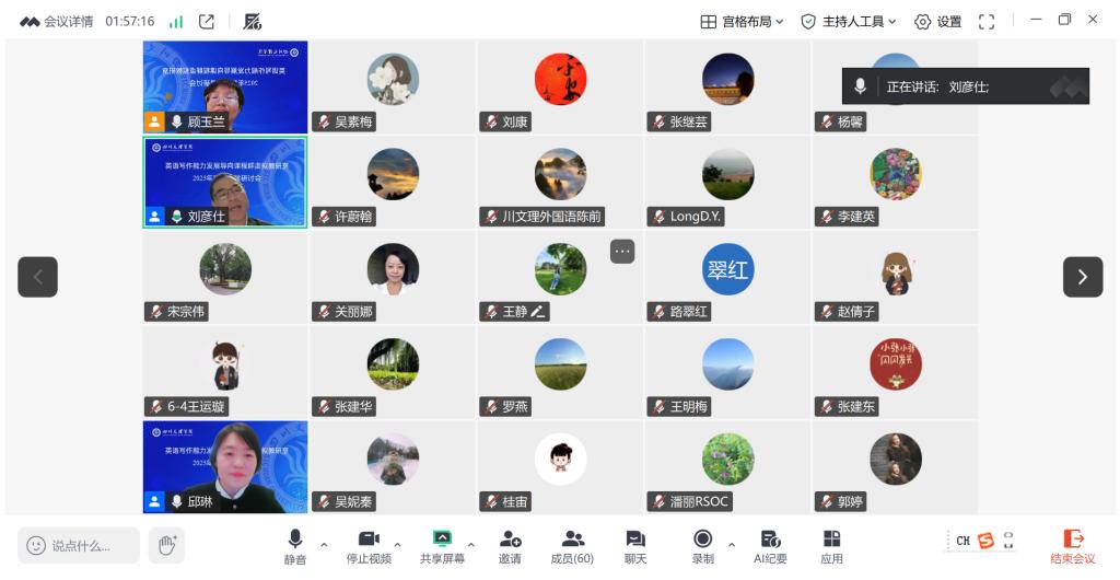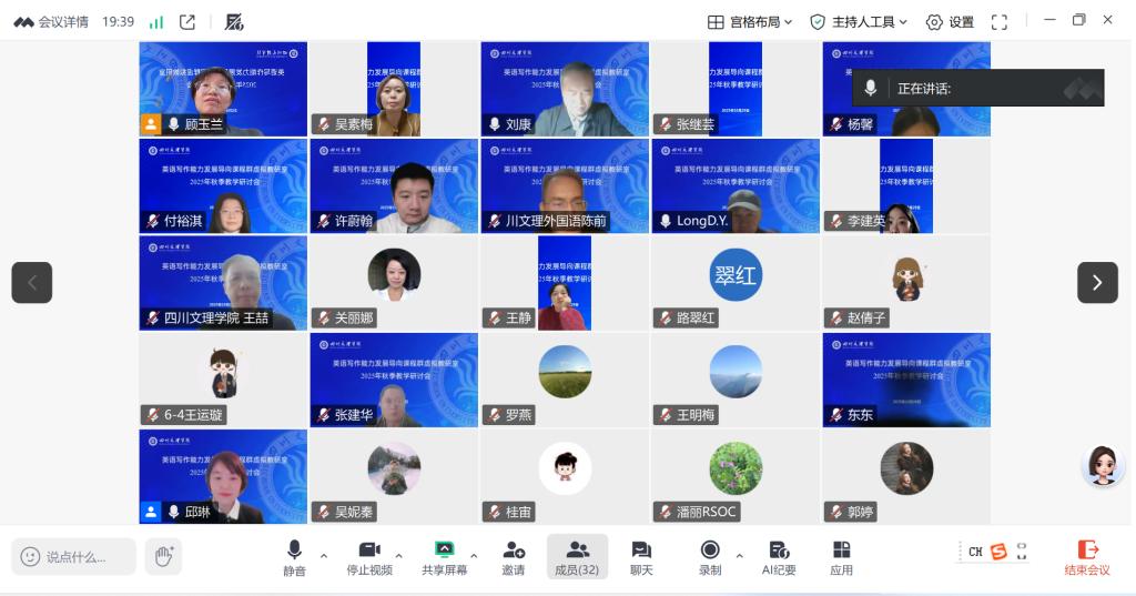 为深化外语课堂教学改革,提升教师课程设计与教学能力,2025年10月29日晚,学院写作能力发展导向课程群虚拟教研室线上举办了聚焦英语写作能力发展导向的阅读教学改革与创新专题研讨会。虚拟教研室成员及外国语学院全体教师参会。