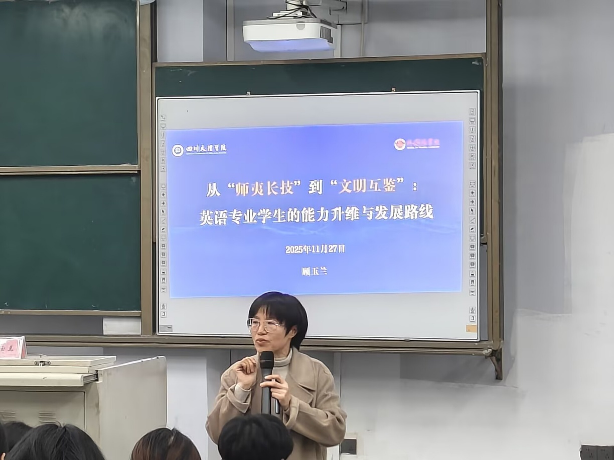 为拓展英语专业学生的学术视野、明晰人才培养与个人发展的可能方向,2025年11月27日,顾玉兰教授于博文楼510教室为英语专业学生带来“从'师夷长技'到'文明互鉴':英语专业学生的能力升维与发展路线”学术讲座。