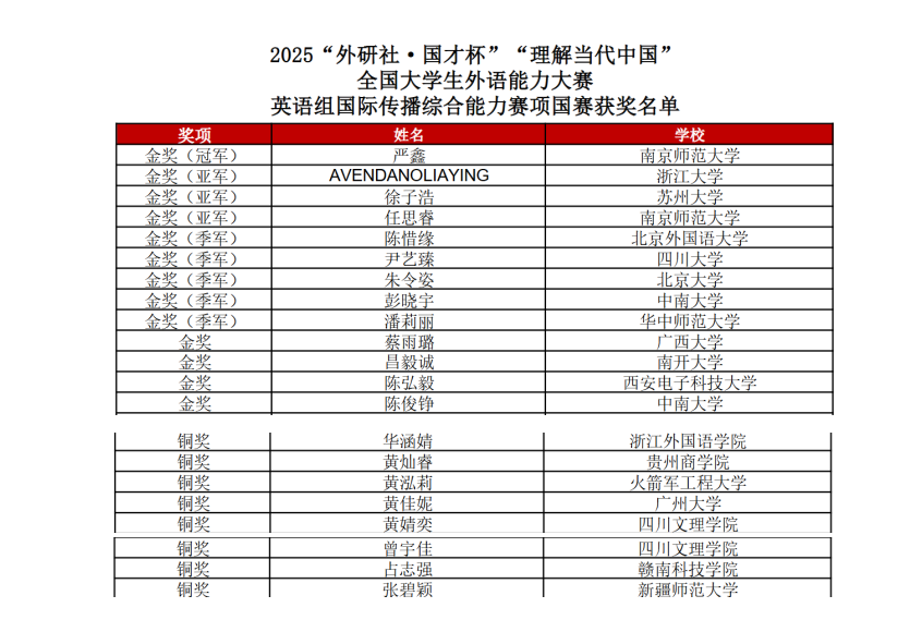 外国语学院选派12名学生参加四川省复赛,斩获金奖2项、银奖3项、铜奖7项,其中,参加英语组国际传播综合能力大赛的6名学生全员获奖,金银铜奖各2人,且金奖获得者黄婧奕、曾宇佳两位同学成功晋级全国总决赛并荣获铜奖,充分展现出外国语学院人才培养的扎实成效与学子出色的专业风采,也彰显了学院英语写作能力发展导向读写教学的显著成效。