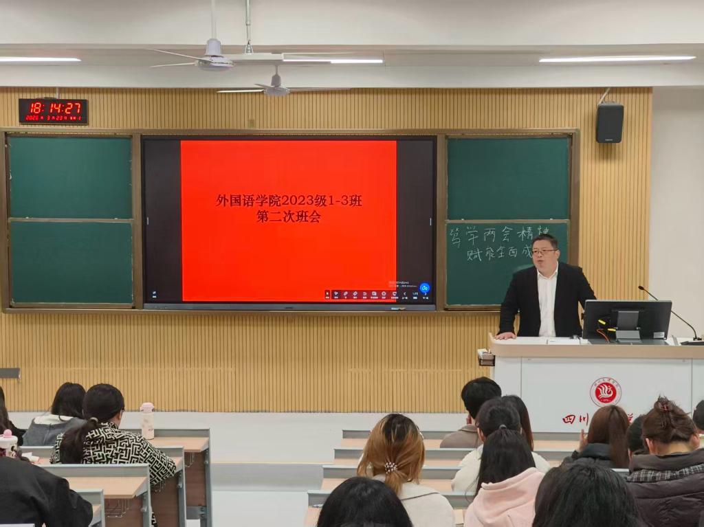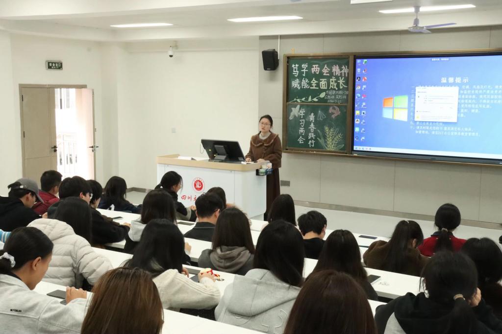 班会伊始,各带班辅导员围绕两会精神核心要义展开了深入讲解,引导同学们把个人理想与国家发展紧密结合,坚定理想信念、厚植家国情怀,同时围绕“新时代青年如何践行两会精神”开展了交流研讨,引导同学们主动分享学习感悟、明确成长方向。此外各带班辅导员还鼓励同学们结合外语专业特色,以国际视野讲好中国故事、传播中国声音,增强了同学们专业使命感与时代责任感。