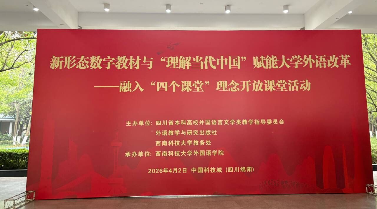 4月2日,由四川省普通本科高等学校外国语言文学类专业教学指导委员会、四川省高等教育学会高校外语专业委员会与外语教学与研究出版社主办,西南科技大学外国语学院承办的“新形态数字教材与‘理解当代中国’赋能大学外语改革——融入‘四个课堂’理念开放课堂活动”在西南科技大学马克思主义学院报告厅举行。本次活动吸引了全国42所高校近200名外语专业负责人和骨干教师,大家齐聚西南科技大学,共探“四个课堂”理念下的外语课程改革与教学创新。学院教师张继芸和王静参会。