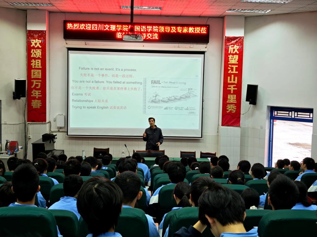 签约仪式后,两场高质量英语专题讲座同步开讲。外籍教师Hamed以“Failing Forward”(从失败中前进)为主题,结合名人成长经历引导学生正确看待失败,传递“失败是成功过程而非终点”的理念。他围绕好奇心、韧性、反思、自我认知等核心素养,通过英语案例与情境教学提升语言应用能力,阐释“犯错—反思—调整—成长”的逻辑路径,鼓励学生在英语学习中勇于尝试、不惧失误,实现了英语语言能力提升与思辨素养、成长心态培育的有机统一。