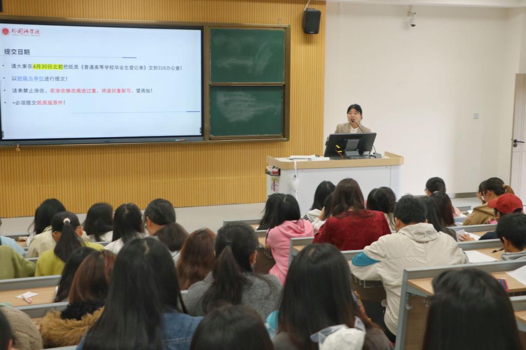活动中,宋宗伟老师重点强调了毕业论文答辩及学位申请相关事宜,提醒同学们牢记4月22日答辩时间,严守纪律,答辩后认真修改论文并及时上传相关材料,同时预告了5月中旬的师范生免试认定工作。叶柳老师详细讲解了毕业生档案派遣及后期安排,包括档案三类去向、考研调档函上传、“川e就”就业平台信息填报、宿舍退宿及图书归还等手续,要求同学们文明离校。林妍老师结合职业发展需求,为同学们提供了求职方向、简历优化及面试准备等方面的职业指导,并现场指导大家填写《普通高等学校毕业生登记表》。