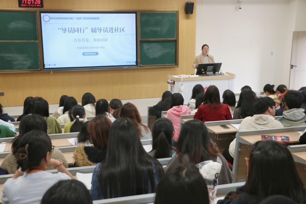 2026年4月21日16:30,外国语学院在博文楼214教室开展“导员同行”辅导员进社区活动,面向2026届全体毕业生召开毕业生大会。本次活动以辅导员下沉社区、零距离服务学生为宗旨,学院学工办主任叶柳、商务英语教研室主任兼毕业班辅导员宋宗伟、教师代表林妍共同走进社区,与毕业生面对面交流,切实打通育人“最后一公里”。