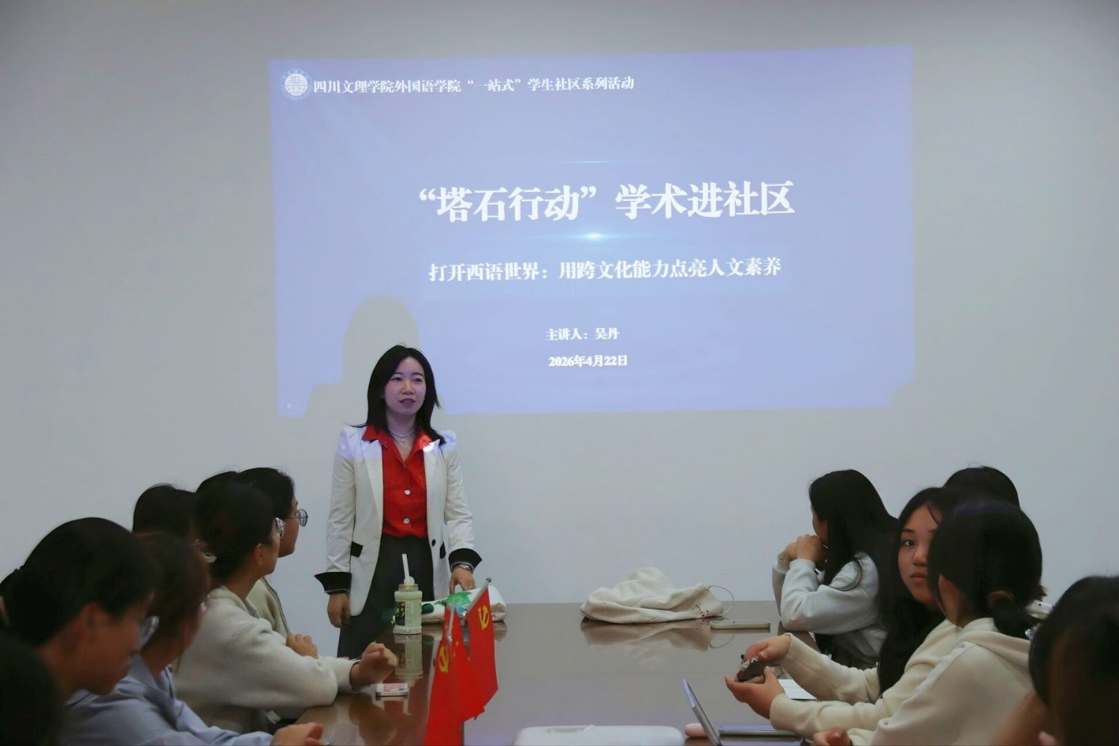 4月22日,我院在莲湖校区学生处活动室开展了以“打开西语世界:用跨文化能力点亮人文素养”为主题的“塔石行动”学术进社区“一站式”学生活动。本次活动由吴丹博士主讲,旨在推进“一站式”学生社区建设,营造浓厚的学术文化氛围。