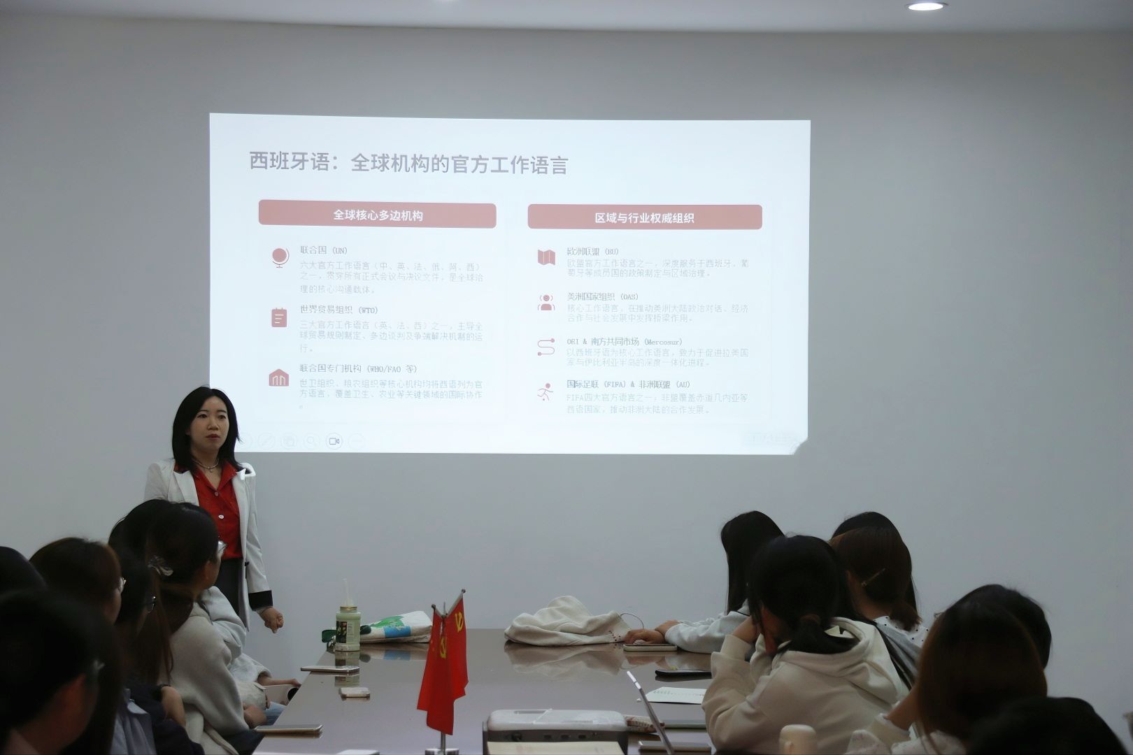 活动伊始,吴丹老师以互动体验环节拉开序幕,带领同学们学习基础西班牙语表达,让大家在趣味互动中初步感受西语的语言魅力,激发了同学们对西班牙语及西语文化的浓厚兴趣。