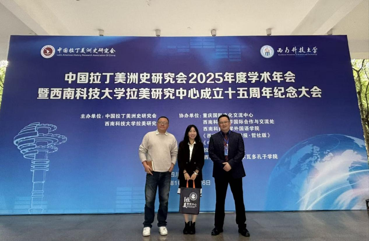 10月24日至26日,由中国拉丁美洲史研究会与西南科技大学拉美研究中心联合主办,重庆国际文化交流中心、西南科技大学国际合作与交流处等单位协办的“中国拉丁美洲史研究会2025年度学术年会暨西南科技大学拉美研究中心成立十五周年纪念大会”在四川绵阳隆重召开。来自南开大学、中国社会科学院、中国人民大学、南京大学等全国多所高校及科研机构的专家学者齐聚一堂,围绕拉美历史文化、中拉关系、区域国别研究等核心议题展开深入研讨与交流。我院师嘉林博士、吴丹博士受邀参会。
