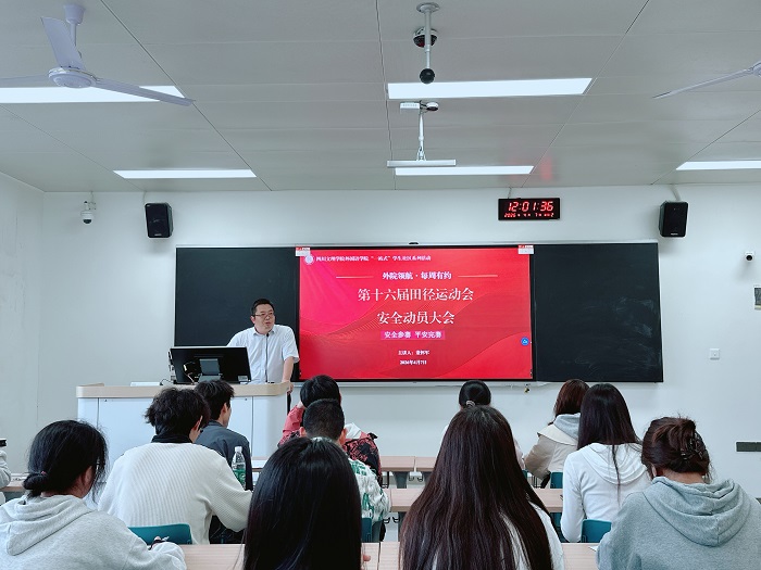 为切实筑牢学校第十六届田径运动安全防线,保障学院参赛选手安全参赛、平安完赛,4月7日中午12点,外国语学院在博文楼324教室召开安全动员大会。学院党委副书记董怀军出席会议并讲话,林妍老师及全体参赛选手参加会议。
